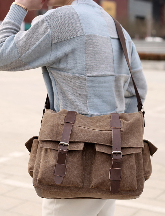经典帆布笔记本电脑挎包男士公文包 材质:16盎司纯棉帆布,假PU皮饰物 尺寸:50*37*15CM 复古的外观,老派的风格永远不会过时,重型帆布材料上的假PU皮装饰,前面有两条皮带封口,一条长的可调节肩带,主仓顶部有拉链封口,前面有两个翻盖口袋,里面有多个口袋,包括一个笔记本电脑保护套,后部有一个拉链口袋用于放置重要的配件,高品质的金属硬物和附件。