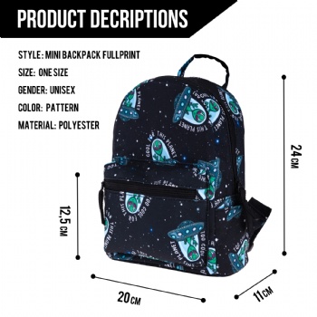 Full prints can be customizable;Mini design;Unisex but more welcomed by kids and women;One main zippered pocket with a front zippred pocket.Suitable for kindergarten,outdoors,daypacks,short hiking,trekking trip.